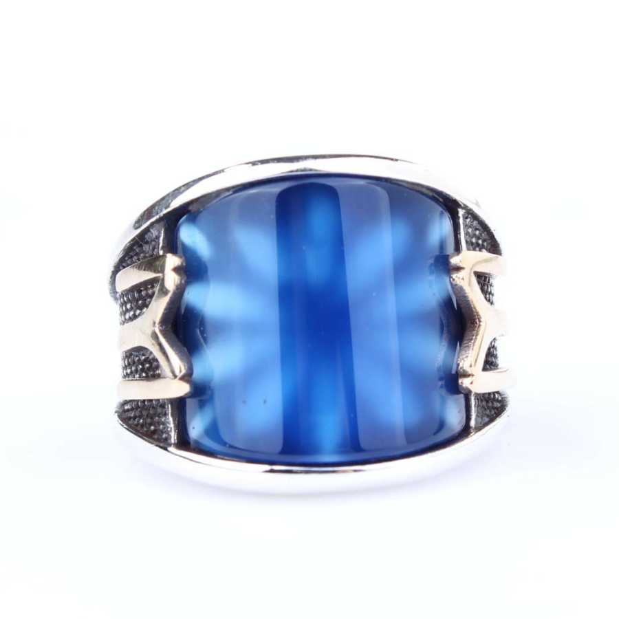 Dogal Tasli Yuzukler Mavi Akik Tasli Gumus Erkek Yuzuk Kaliteli Ve